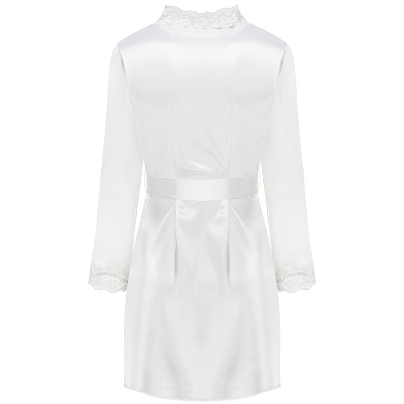 Um conjunto de roupa interior excepcionalmente bonito em cetim cru brilhante, um roupão com uma camisa que vai até o meio da coxa. A frente e as mangas compridas do roupão amarradas na cintura com um cinto são decoradas com lindas rendas. T-shirt com alças finas ajustáveis, decorada com a mesma renda no busto. Tanga incluída.